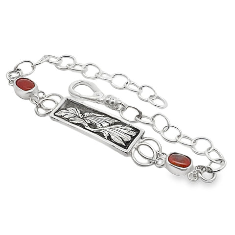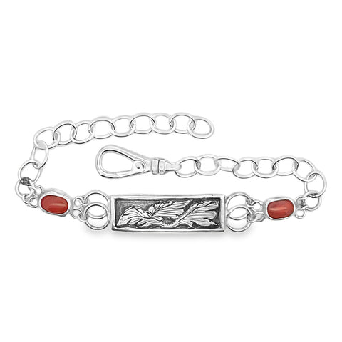 Inspired by the graceful silhouette of the English oak leaf, this hand-engraved sterling silver bracelet captures nature's quiet elegance. The centerpiece showcases meticulous artisanal detailing, flanked by warm carnelian stones set in protective bezels that glow like autumn light. Crafted entirely in .925 sterling silver and designed with an adjustable fit, this piece moves with you—a wearable meditation on growth, strength, and the beauty found in life's natural cycles.